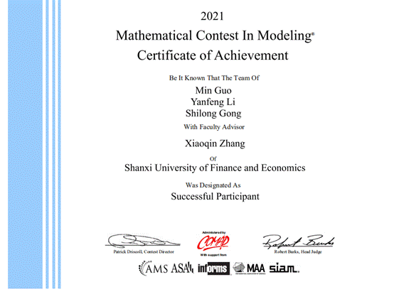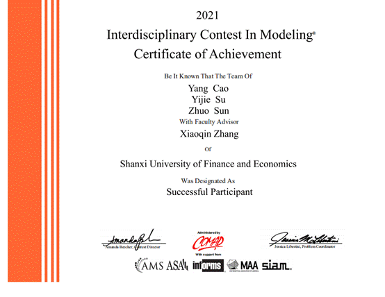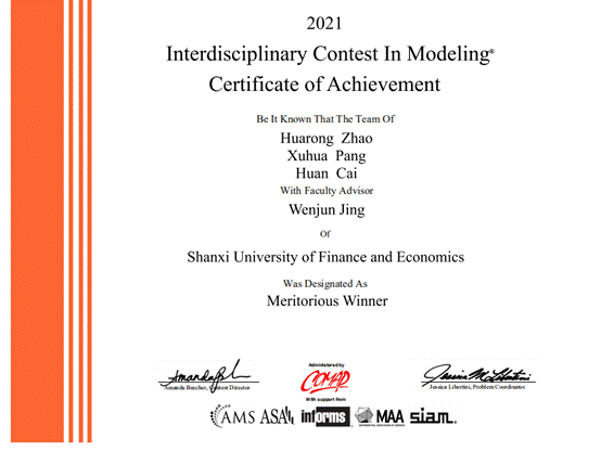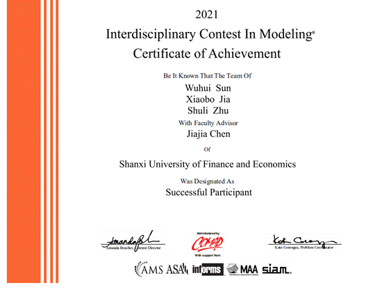近日,由美国数学及其应用联合会(COMAP)主办的2021年美国老员工数学建模竞赛成绩揭晓,公司beat365正版组织张晓琴、陈佳佳、荆文君老师带队的四个参赛队伍取得优异的成绩,分别荣获一等奖(Meritorious Winner)1项、三等奖(Successful Participant)3项。