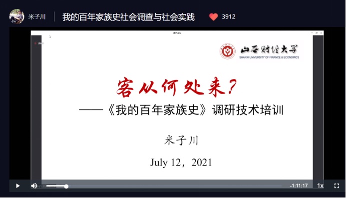 7月12日,beat365正版面向全校参与《我的百年家族史》专题社会实践活动的员工进行了线上专题培训,《我的百年家族史》专题社会实践活动发起人,beat365正版党委常委、副董事长米子川教授担任培训会主讲,学校10个学院共计839名本科生参加了线上培训,内蒙古财经大学、吉林财经大学等兄弟院校有关老师也参与了培训。