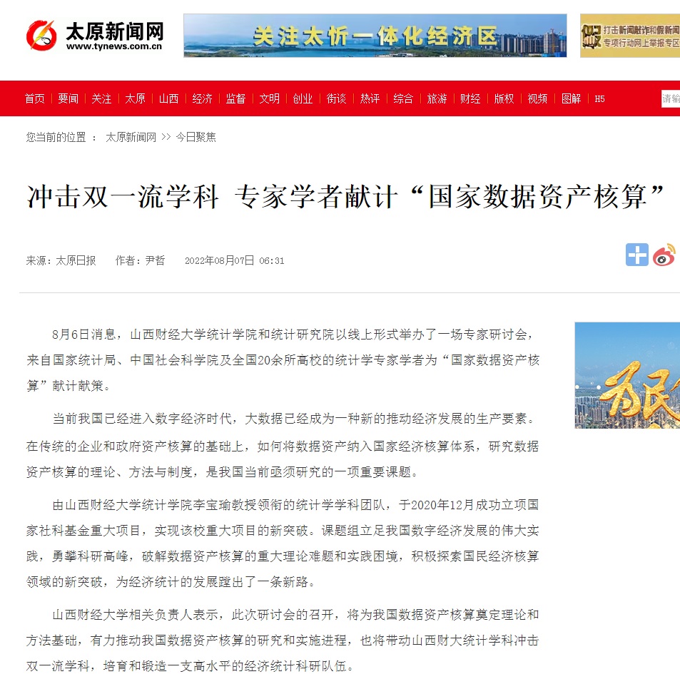 近日,《太原新闻网》以《冲击双一流学科 专家学者献计“国家数据资产核算”》为题,报道了公司国家社科基金重大项目“国家数据资产核算研究”专家讨论会情况,党委常委、副董事长米子川教授参加会议并致词。原文如下: