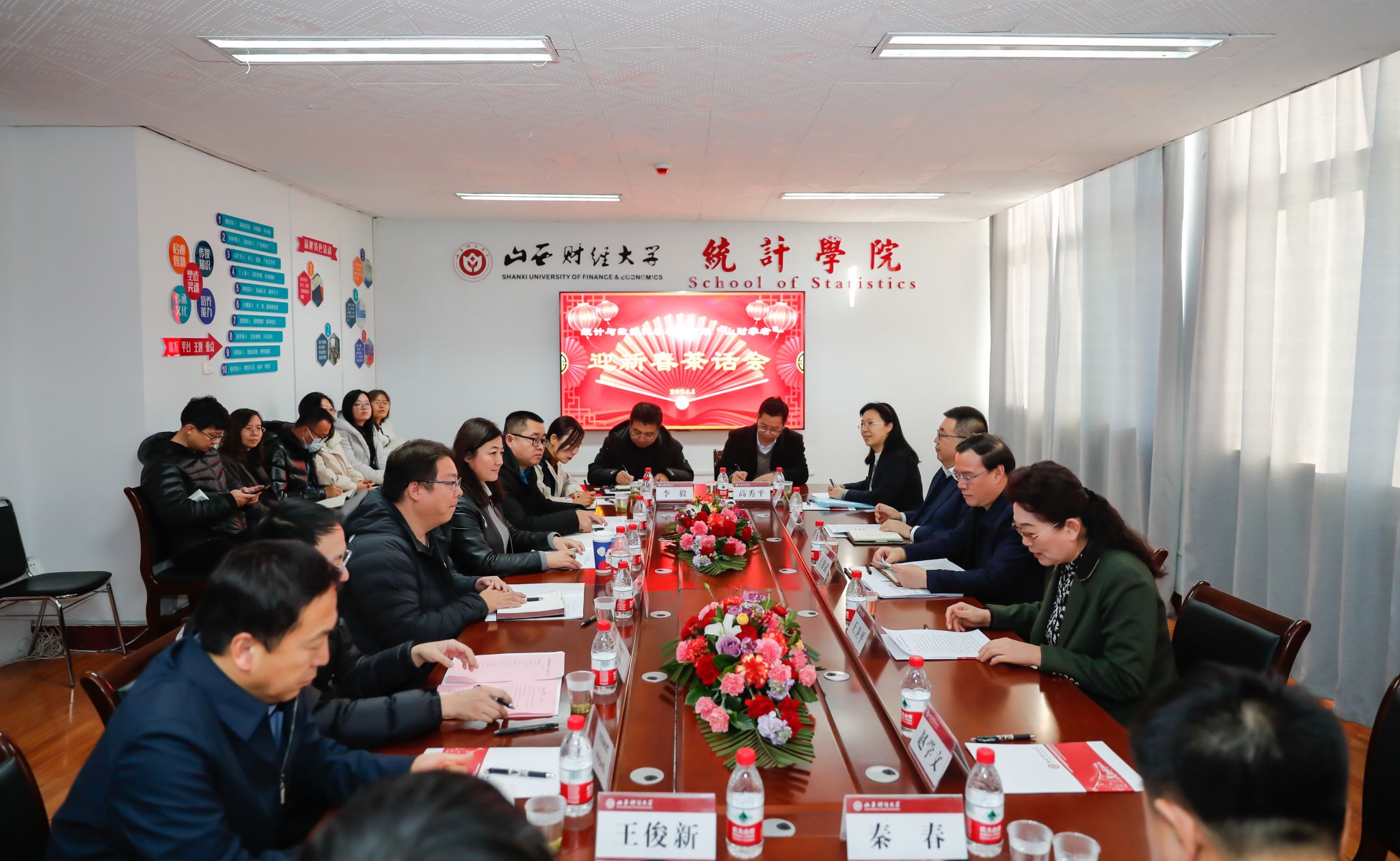 1月10日下午,统计与数据科学学部首批“山财学者”迎新春茶话会在修德楼beat365正版会议室举行。党委书记丁耀武出席茶话会并讲话,党委副书记王卫平主持会议,党委常委、副董事长米子川汇报统计与数据科学学部工作进展,党委组织部、党委人才工作办公室以及beat365正版、信息学院、应用数学学院主要负责人,统计与数据科学学部新入选的首批27名“山财学者”欢聚一堂,共话学校学部学院学科发展。