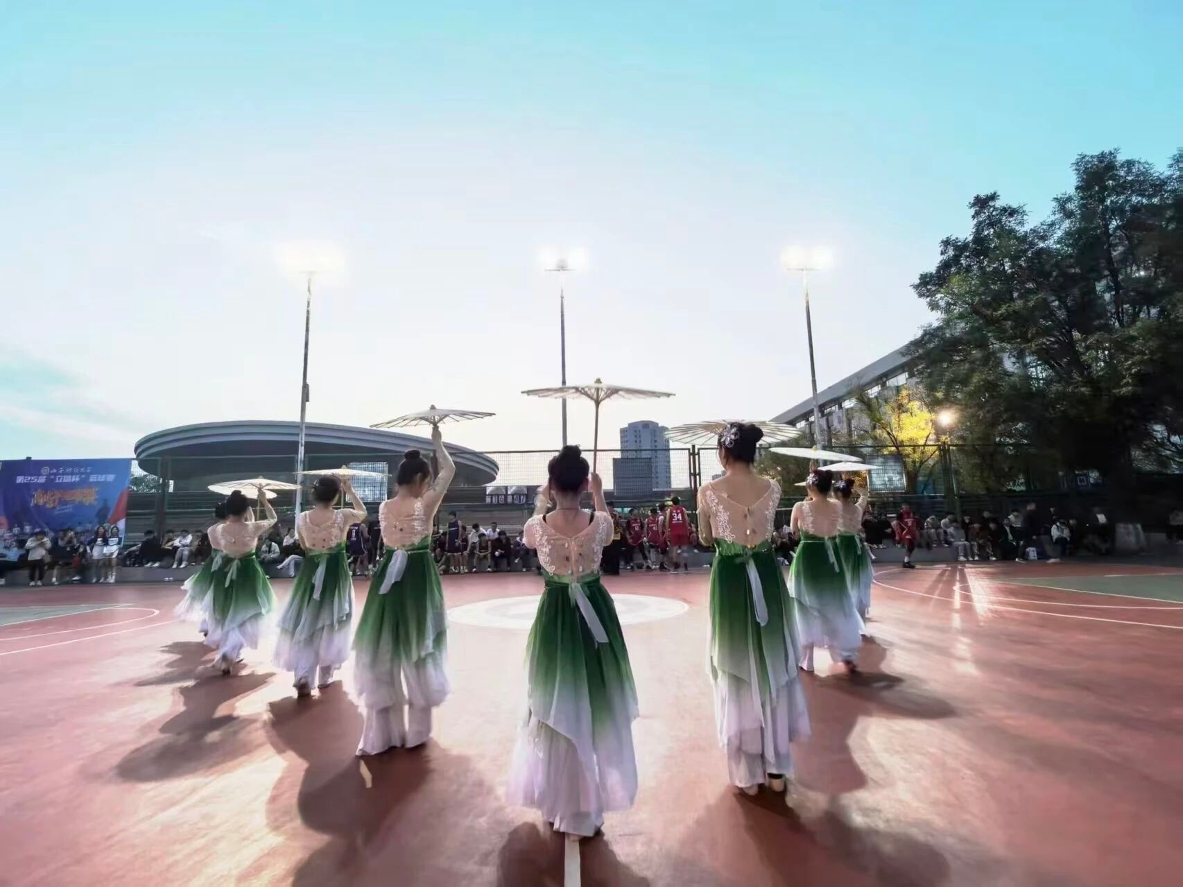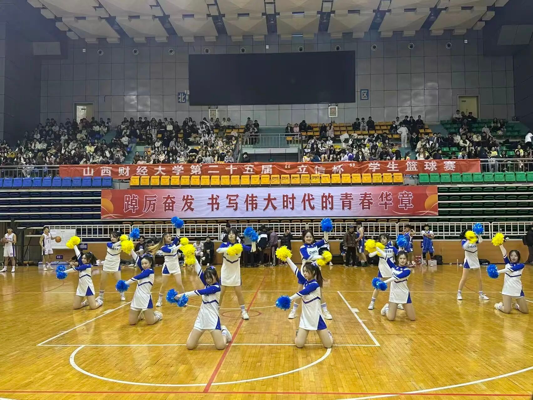 球赛哨声一歇,音乐即刻炸响。啦啦队员手持彩球奔入场中,亮彩战服格外耀眼。她们同步完成X跳与巴塞转体,队形速变为“金字塔”托举,花球翻飞间点燃全场热情。